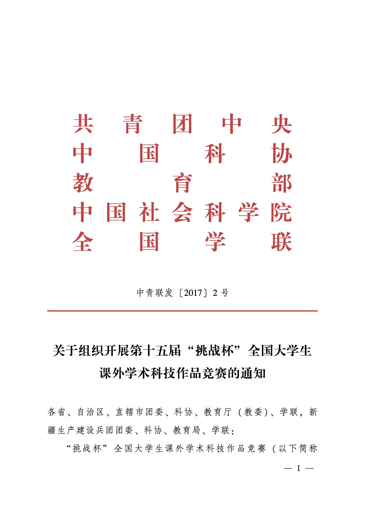 关于组织开展第十五届 “挑战杯”全国大学生课外学术科技作品竞赛的通知 组委会 发表于 2017.03.11 | 点击数85543 新闻标签: 通知正文下载: 关于组织开展第十五届 “挑战杯"全国大学生课外学术科技作品竞赛的通知(PDF格式)
