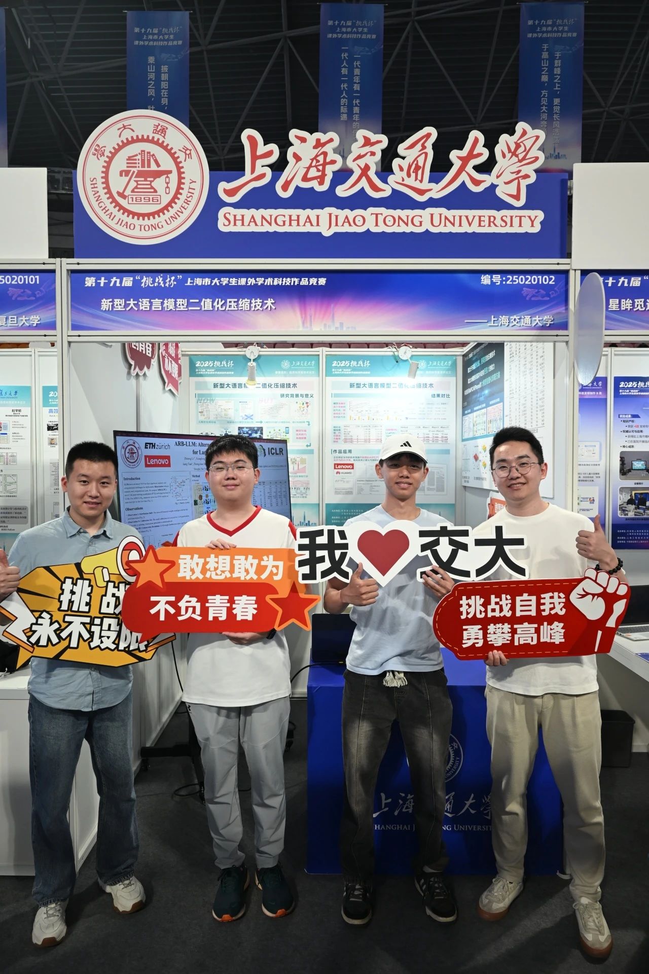 在比赛设置的现场展位,老师学生们认真观摩、积极互动,在交流中碰撞思想火花、在研讨中凝聚智慧力量。不少人在上海交通大学《新型大语言模型二值化压缩技术》项目展位前驻足。项目成员、大二学生闫相龙介绍,“我们以改进大语言模型为核心,在压缩算法上进行了创新,帮助大语言模型降低所需要的参数量,提高其在内存受限设备的应用广度。”“希望通过比赛,我们的研究能获得落地的机会。”