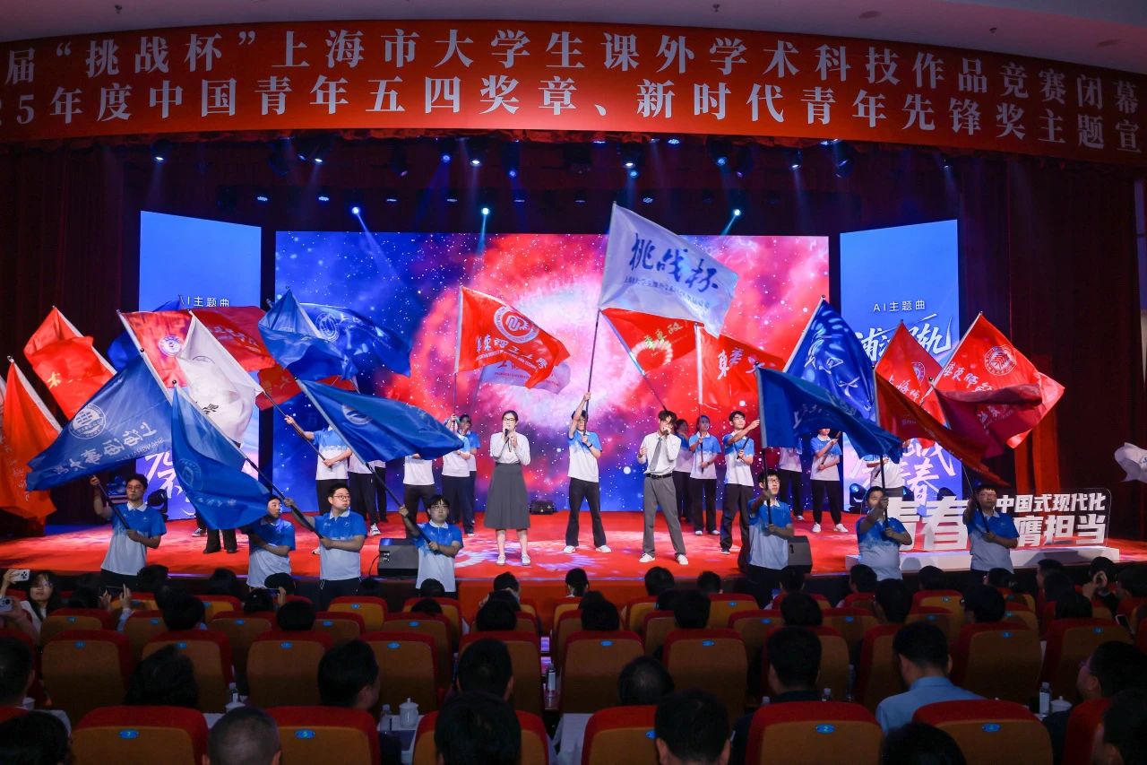 闭幕式上,由青年学子和智能机器人共同带来开场舞蹈《人机共舞 智启未来》。值得一提的是,活动现场播放的主题曲《浦江星轨》,是上海青年学子通过Deepseek、Suno AI、即梦AI等生成式人工智能工具创作的。