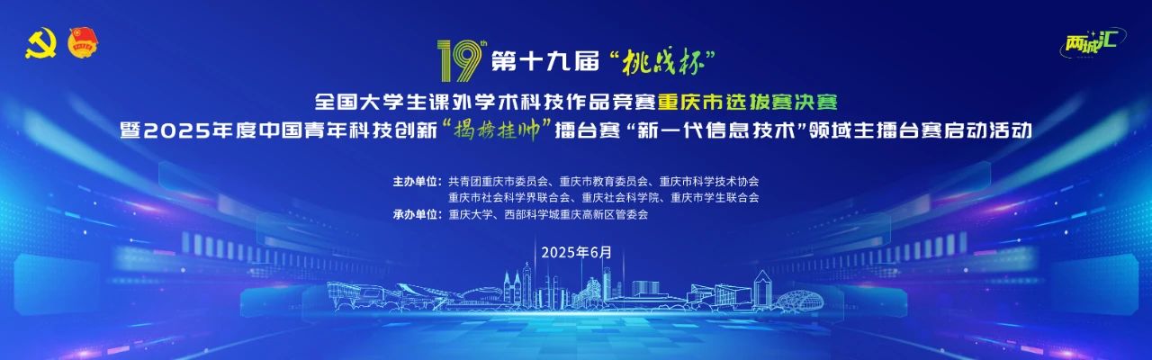2025年6月5日—6日,由团重庆市委、重庆市教委、重庆市科协、重庆市社科联、重庆社科院和重庆市学联联合主办,重庆大学、西部科学城重庆市高新区管委会承办的第十九届“挑战杯”全国大学生课外学术科技作品竞赛重庆市选拔赛决赛暨2025年度中国青年科技创新“揭榜挂帅”擂台赛“新一代信息技术”领域主擂台赛启动活动在中国重庆·科学会堂顺利举行